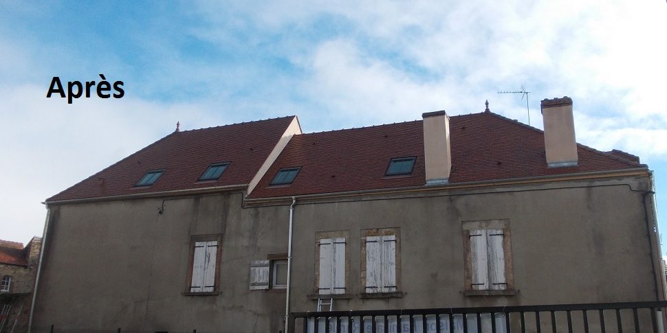 Un aperçu Avant /Après d’une rénovation de toiture que nous venons de terminer : Tuiles plates, fenêtres de toit, rénovation de cheminées et création d’une lucarne.